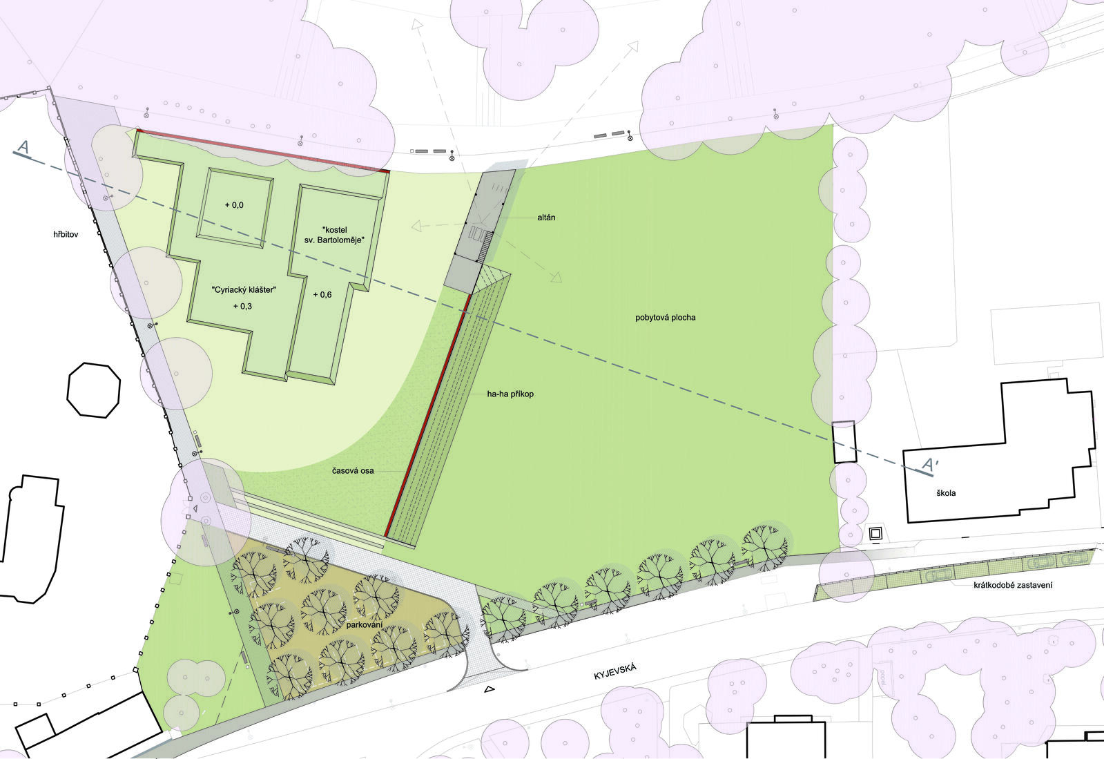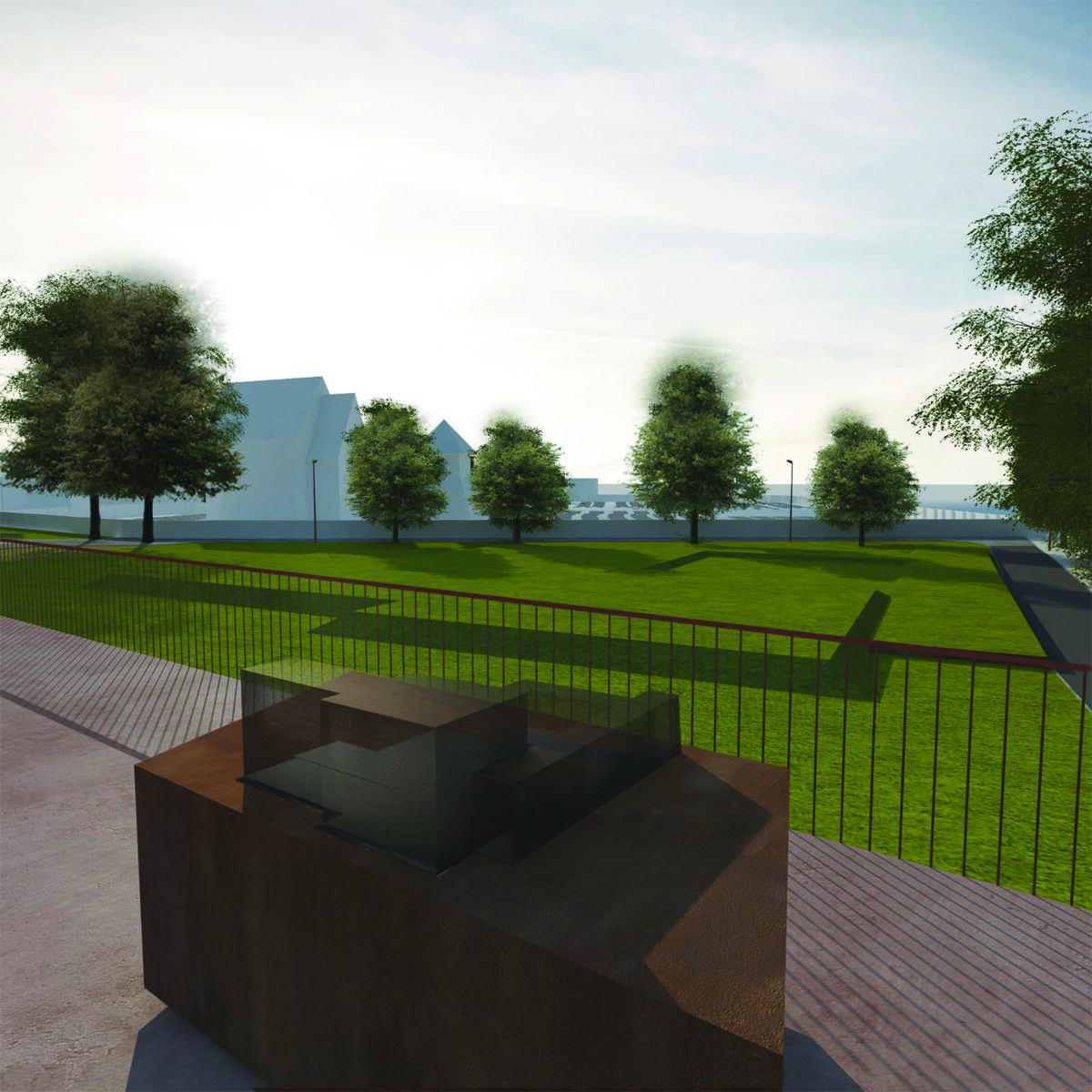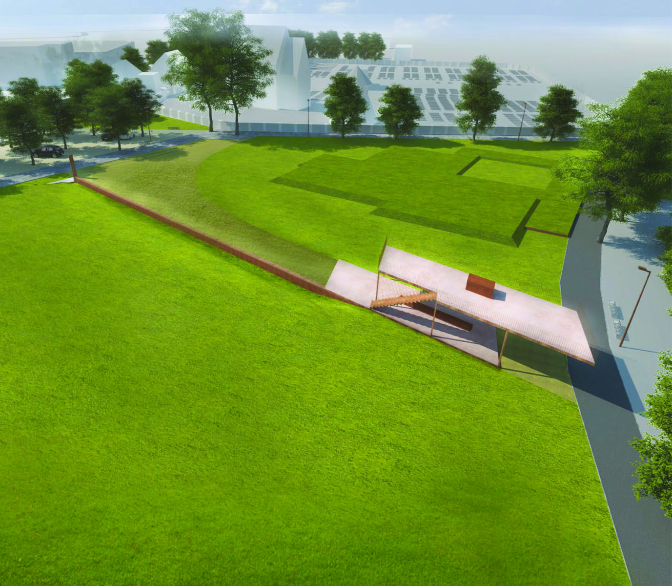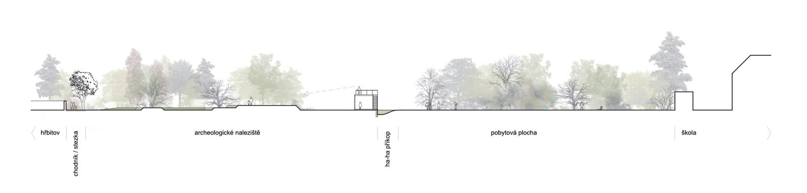 Návrh kombinuje historický odkaz se současným využitím území. Ústřední linie ha-ha příkopu je švem, který spojuje dvě odlišné plochy - aktivní a současnou „pobytovou“ plochu a pasivní s historickým odkazem. Aktivní ve smyslu využití území, které se odvíjí od aktivity uživatelů. Může se zde hrát fotbal, pořádat piknik nebo venčit pes. Pasivní plochou je zde naopak míněno významové předurčení přítomností naleziště - historického artefaktu. Linie ha-ha příkopu je zároveň časovou osou, která končí altánem se střešní vyhlídkou a částí expozice. Altán je prvkem, který náleží k oběma plochám a slouží návštěvníkům jak naleziště, tak uživatelům pobytové plochy.