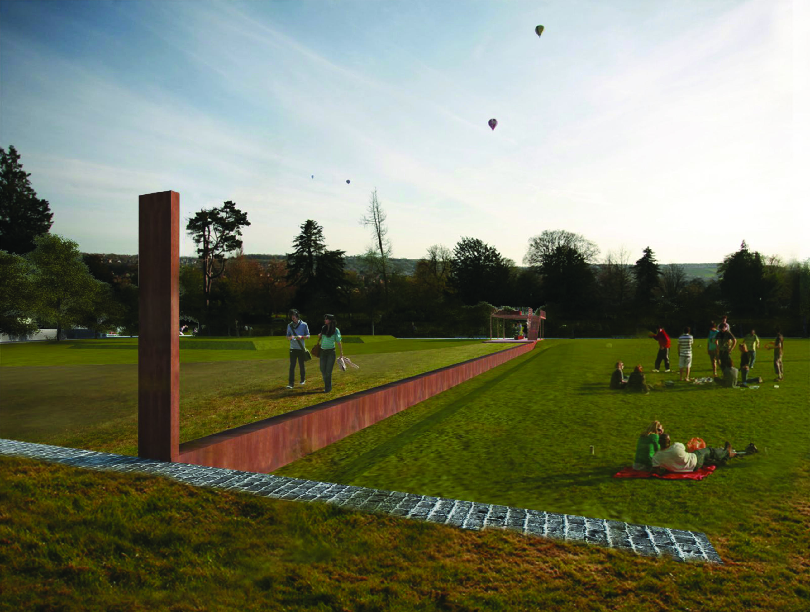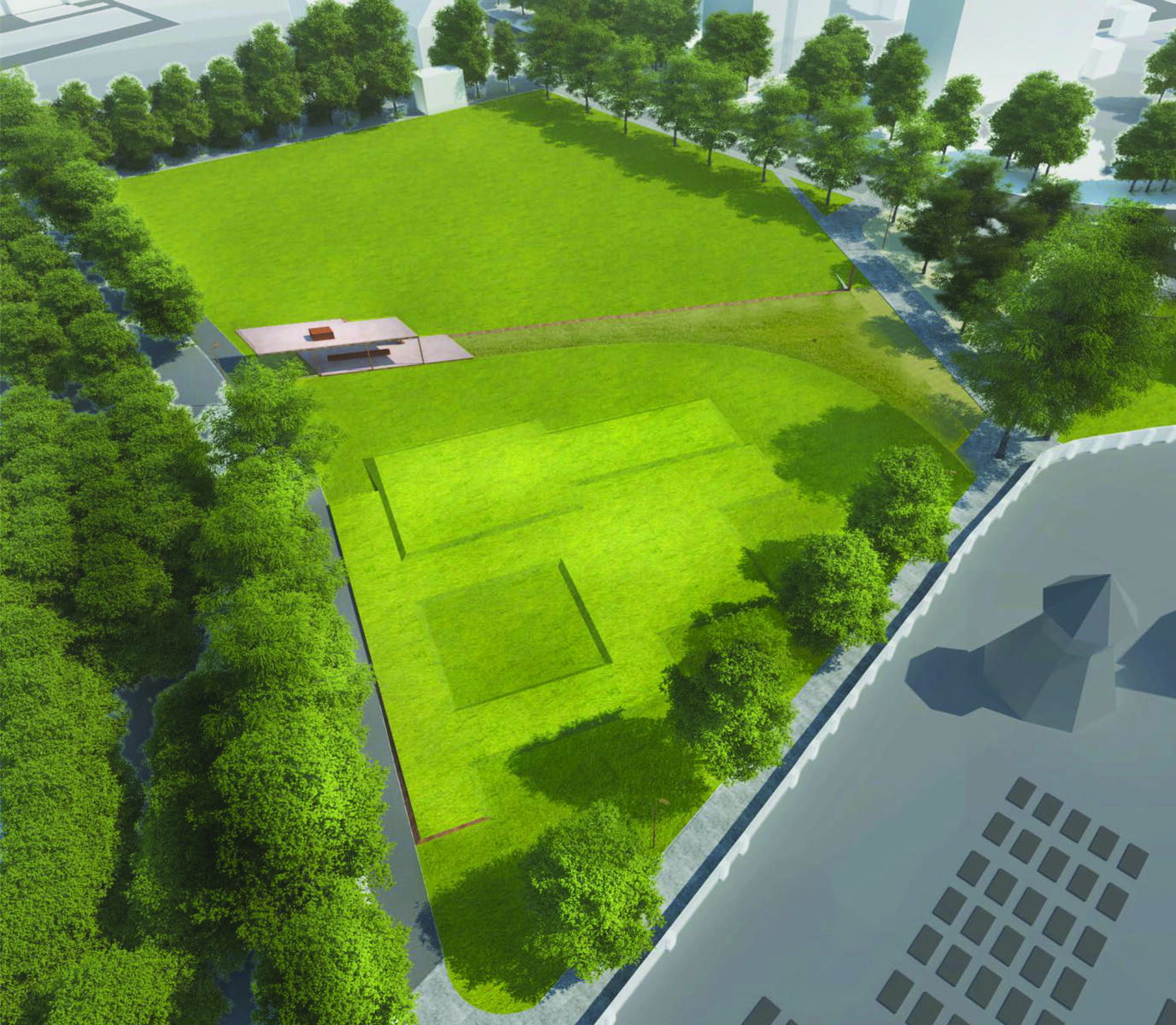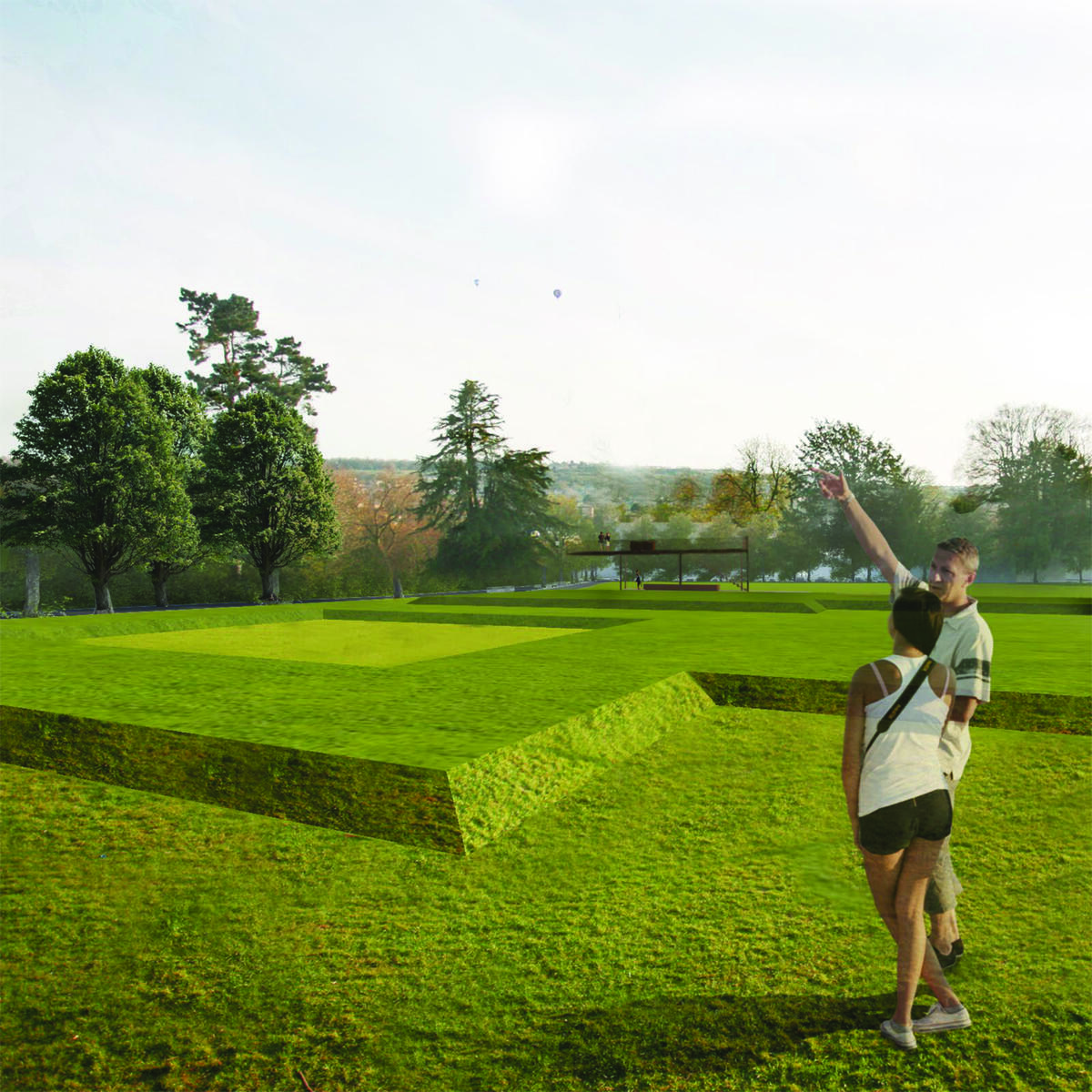 Návrh kombinuje historický odkaz se současným využitím území. Ústřední linie ha-ha příkopu je švem, který spojuje dvě odlišné plochy - aktivní a současnou „pobytovou“ plochu a pasivní s historickým odkazem. Aktivní ve smyslu využití území, které se odvíjí od aktivity uživatelů. Může se zde hrát fotbal, pořádat piknik nebo venčit pes. Pasivní plochou je zde naopak míněno významové předurčení přítomností naleziště - historického artefaktu. Linie ha-ha příkopu je zároveň časovou osou, která končí altánem se střešní vyhlídkou a částí expozice. Altán je prvkem, který náleží k oběma plochám a slouží návštěvníkům jak naleziště, tak uživatelům pobytové plochy.
