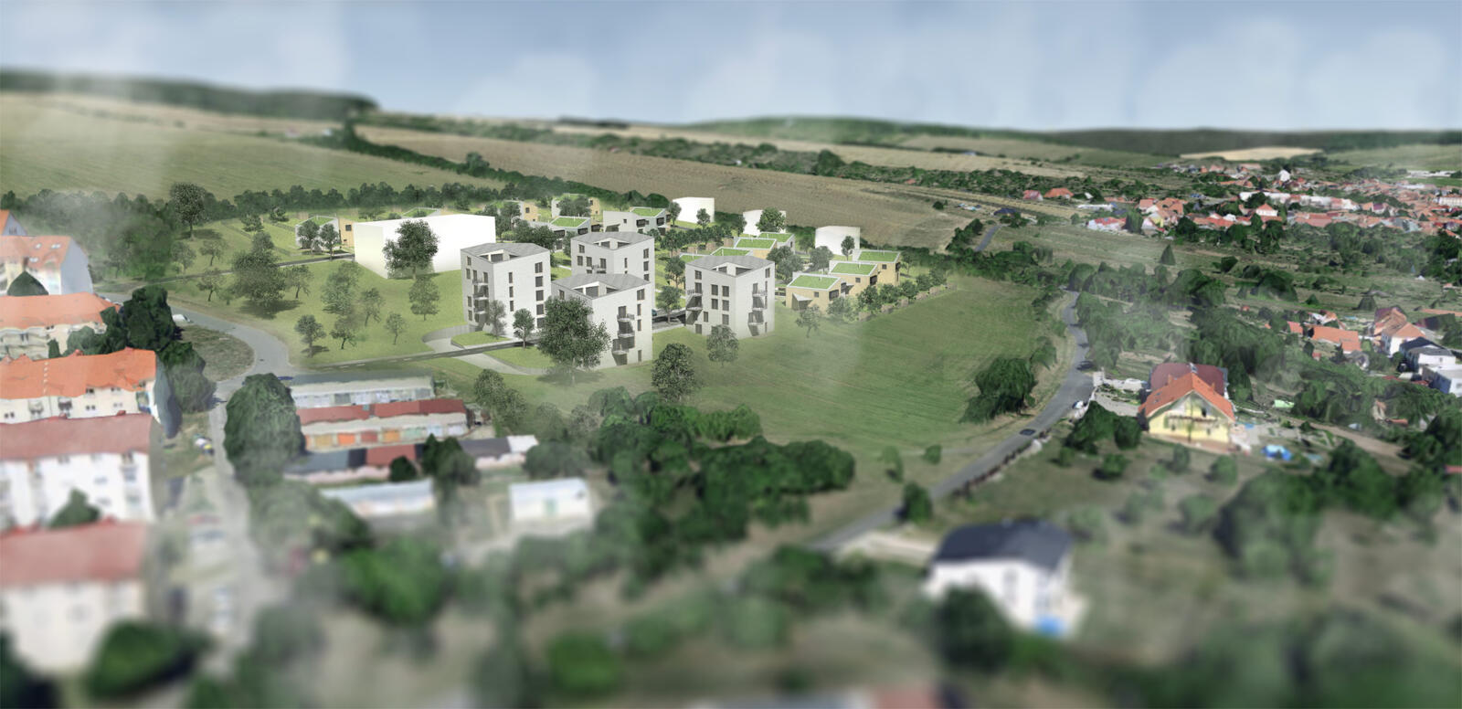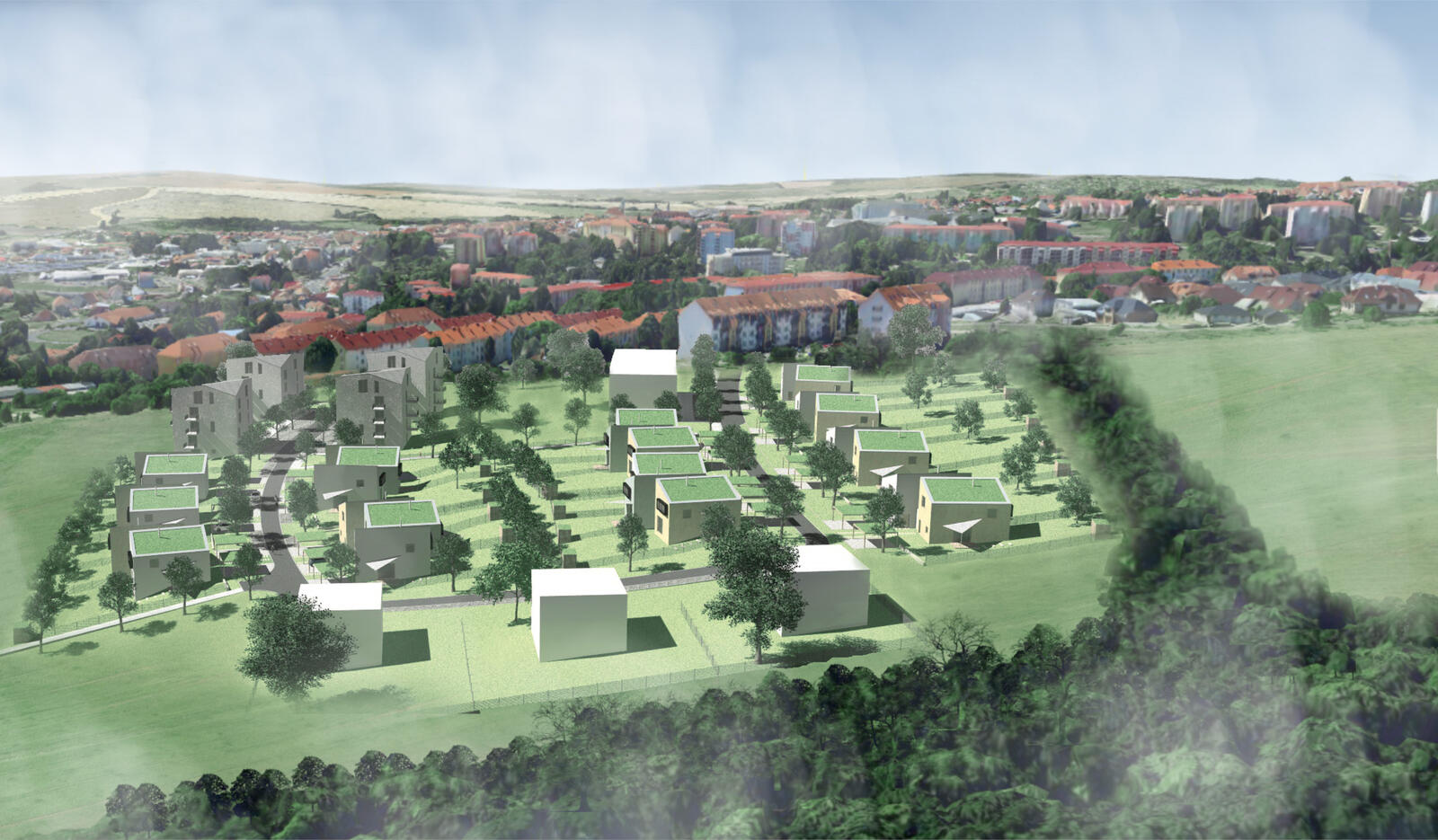 Obytná zástavba na kraji města. Domy, řadovky, bytové domy a veřejná prostranství. Veřejné, poloveřejné a soukromé.